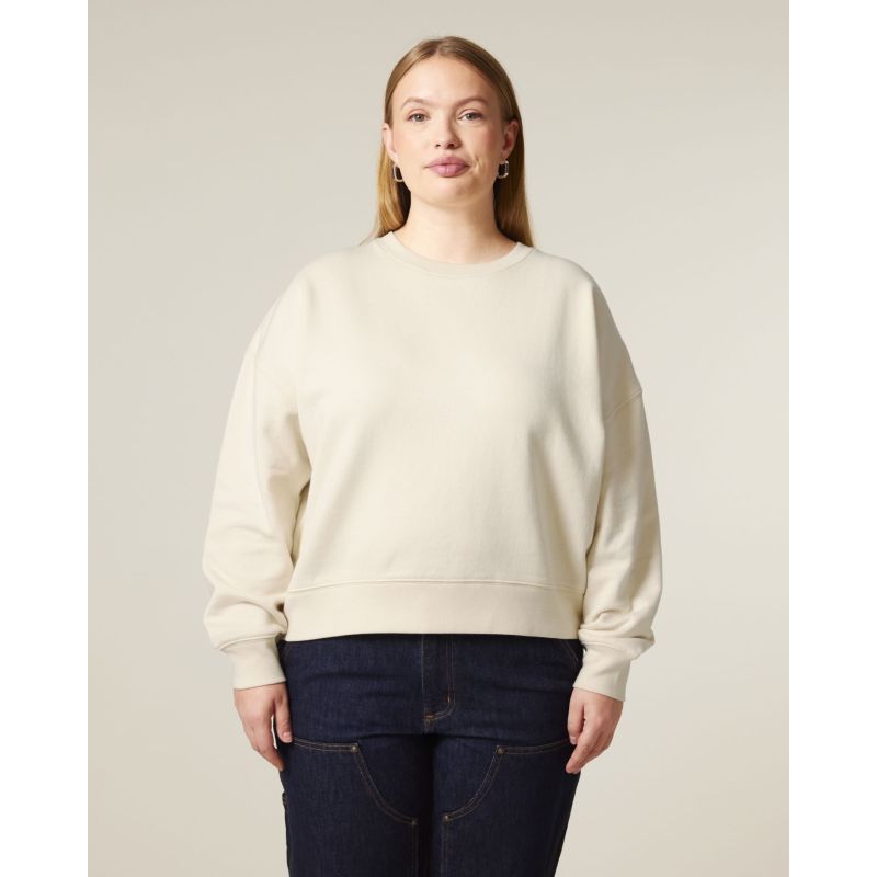 Manches montées Épaules tombantes Côtes 1x1 au col, aux poignets des manches et à l'ourlet du bas Surpiqûres doubles aiguilles sur toutes les coutures Bande de gros grain à l'intérieur du col au dos Demi-lune en tissu de la même matière au dos du cou
